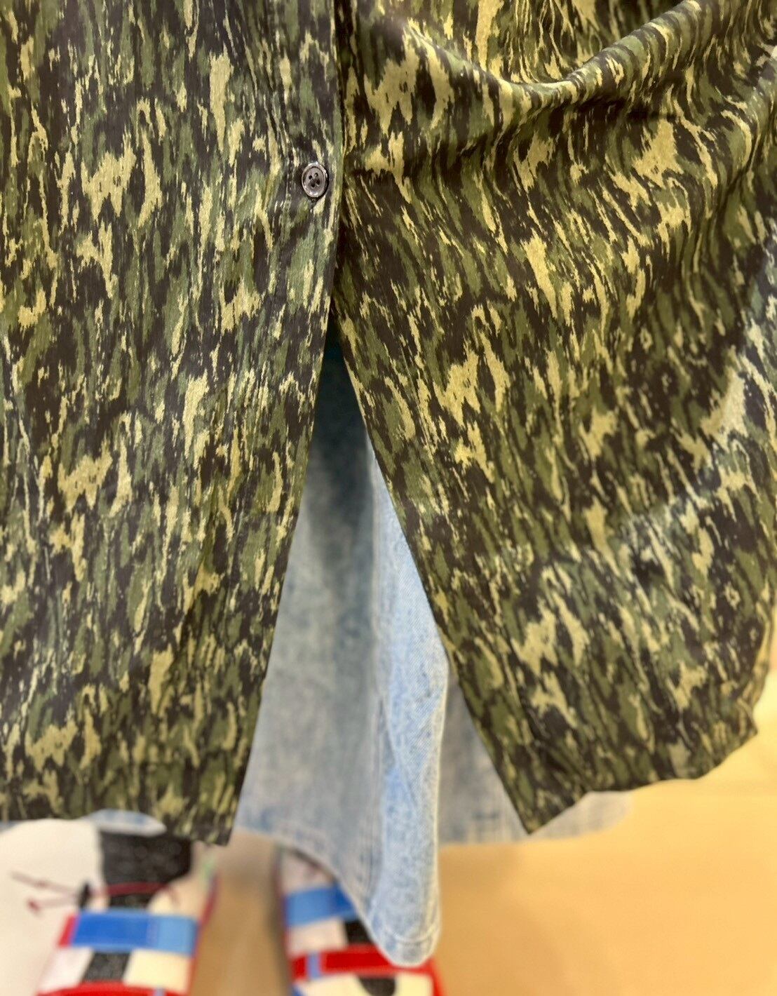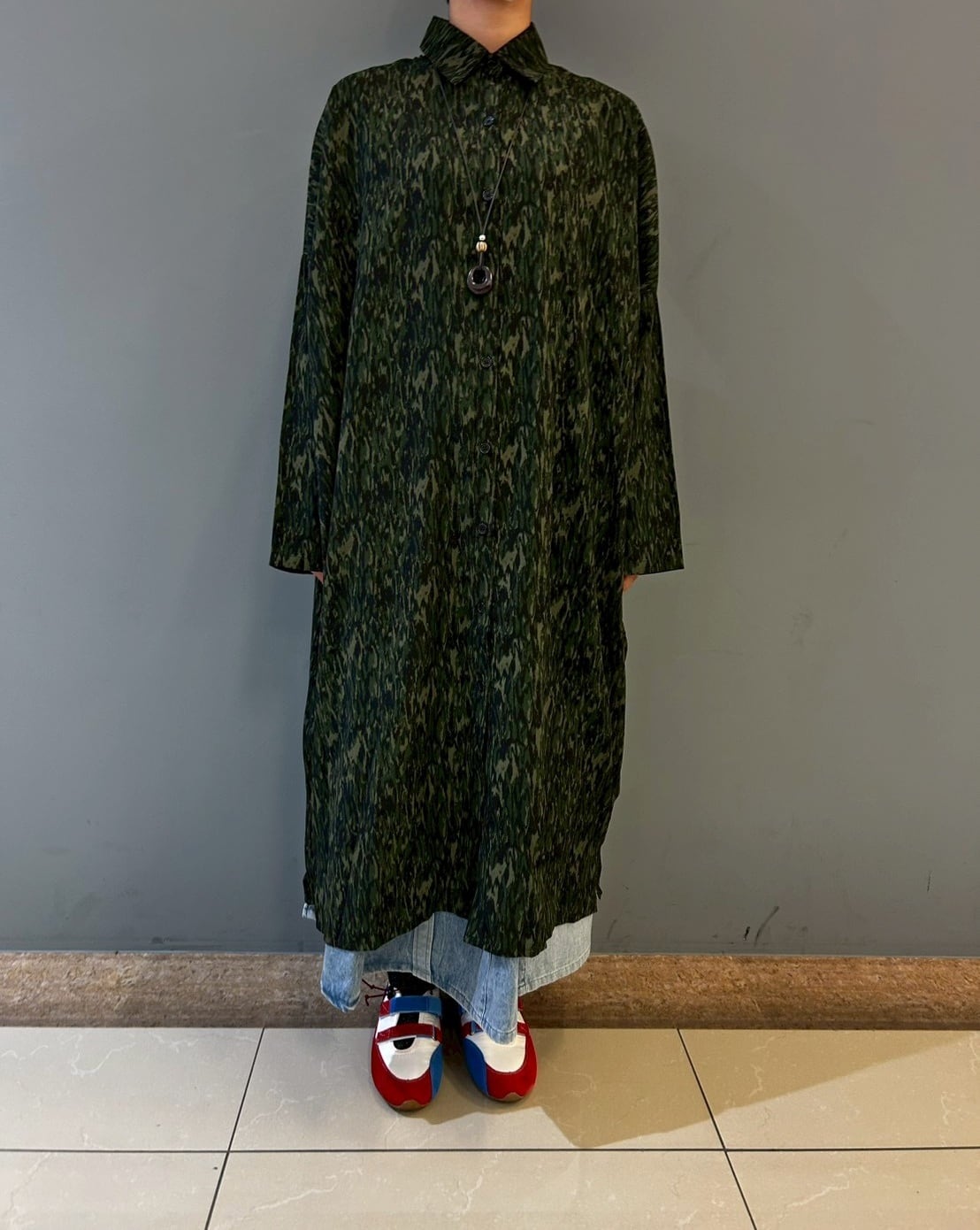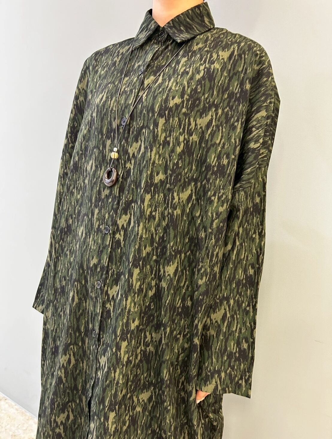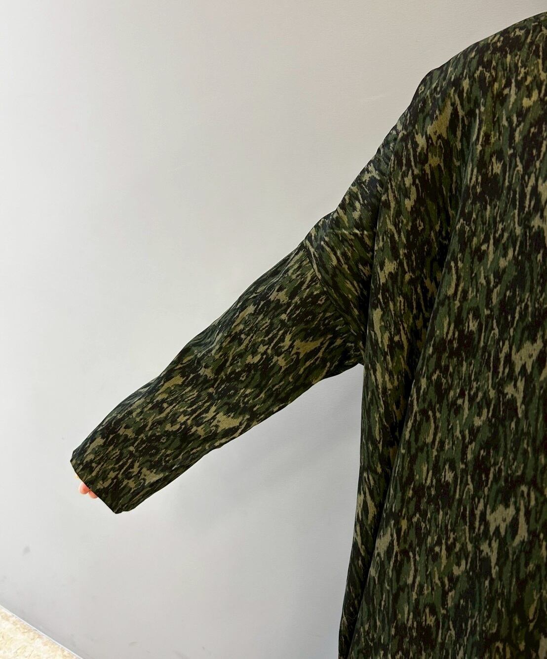 迷彩柄のようなフレイムカモ柄のワンピースです。